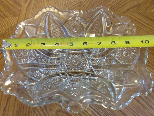 Pre-owned vintage. Clear fine-cut glass and rectangular-shaped Bowl with wavy, square-cut sawtooth edge design. No chips. Cash price $38.00 Please bring exact change. Thank you.