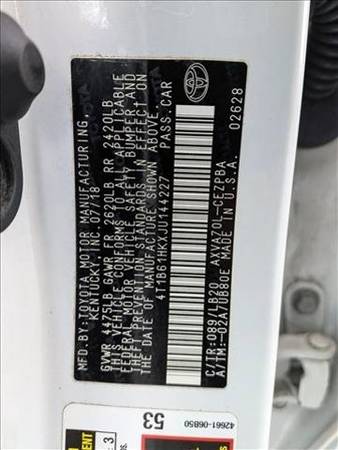 * Audio Package * Driver Assist Package * Panoramic Roof * Panoramic Roof * Leather Seats * Special Color * Protection Package (Q2) * All Weather Floor Liners & Cargo Tray Package * Door Edge Guards * Lane Keeping Assist * Keyless Start * Rear Spoiler * Heads-Up Display * 50 State Emissions * Black; Perforated Leather Seat Trim * Wind Chill PearlThis vehicle includes a Money-Back Guarantee* and passed our precise inspection process. Best of all the price you see is the price you pay. No haggling. No back and forth. No pressure. And this price is so good it is guaranteed. *Money-Back Guarantee is valid for 5 days or 250 miles, whichever comes first. Subject to certain terms and conditions. See store for details. Some restrictions apply.Elevate your drive with this 2018 Toyota Camry XSE, a sporty sedan that blends bold design with Toyota’s legendary reliability. With 117,586 miles, it’s proven its durability while still offering premium comfort and performance. Key Features XSE trim: aggressive styling, sport-tuned suspension, and upscale interior finishes Performance: responsive 4-cylinder engine with smooth handling and efficiency Technology: Apple CarPlay, Bluetooth, and advanced driver-assist safety features Comfort: leather-trimmed seating, dual-zone climate control, and spacious cabin Versatility: ample trunk space and refined ride for commuting or road trips Advantages of AutoNation Toyota Libertyville Transparent pricing with no hidden fees Access to AutoNation’s nationwide inventory and exclusive benefits Certified technicians and trusted Toyota service for peace of mind A customer-first approach backed by a strong reputation in Libertyville This Camry XSE is the perfect mix of style, reliability, and value.