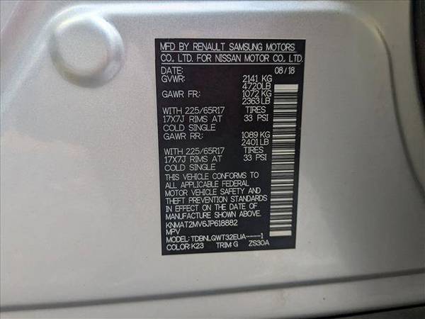 * [L92] Floor Mats & 2-Pc Cargo Area Protector * [B92] Black Splash Guards (Set Of 4) * [B93] Chrome Rear Bumper Protector * Keyless Start * Rear Spoiler * [C03] 50 State Emissions * [G01] March Sop Spec * Brilliant Silver * Charcoal; Cloth Seat TrimThis vehicle includes a Money-Back Guarantee* and passed our precise inspection process. Best of all the price you see is the price you pay. No haggling. No back and forth. No pressure. And this price is so good it is guaranteed. *Money-Back Guarantee is valid for 5 days or 250 miles, whichever comes first. Subject to certain terms and conditions. See store for details. Some restrictions apply.Discover smart versatility with this 2018 Nissan Rogue SV, an SUV that blends comfort, tech, and efficiency, with just 90,741 miles. Perfect for daily drives or weekend getaways, its built to handle lifes adventures with style. Key Features: 2.5L engine with Xtronic CVT for smooth performance Nissan Intelligent Key with push-button start Blind Spot Warning & Rear Cross Traffic Alert Dual-zone climate control and power drivers seat Apple CarPlay & Android Auto connectivity Spacious cargo area with EZ Flex seating system Why Buy from AutoNation Toyota Libertyville? Transparent, haggle-free pricing Multi-point inspection and complimentary maintenance Trusted AutoNation network with local service excellence Full vehicle history and certified technician support Drive home confidence and value, this Rogue SV is ready for your next journey!