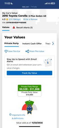 Car is priced according to KBB value ($9,528–$11,806), which shows a private party value of $10,666. I am listing for $10,500 and will only negotiate a little in person for serious cash buyers.