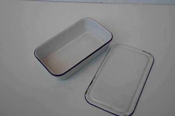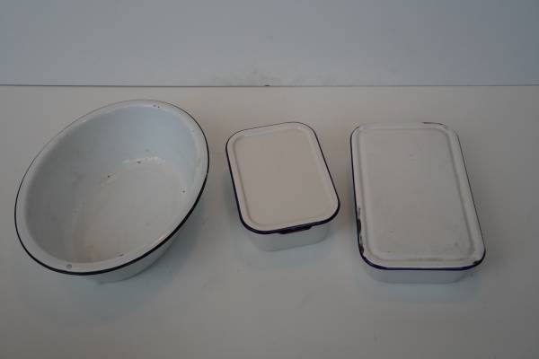(3)porcelain enamel medical pans w/lids 20 1/2"x16 1/2" x 6" oval no lid 13"x18 1/2"x4 1/2" rectangle w/lid 16"x10"x4" rectangle w/lid