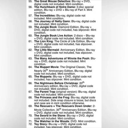 79 Disney + Pixar Movie Collection! Rare DVD + Blu-Ray Lot Mint Condition. I was only allowed so many characters on here so please see pics for each movie included & the additional notes. This...