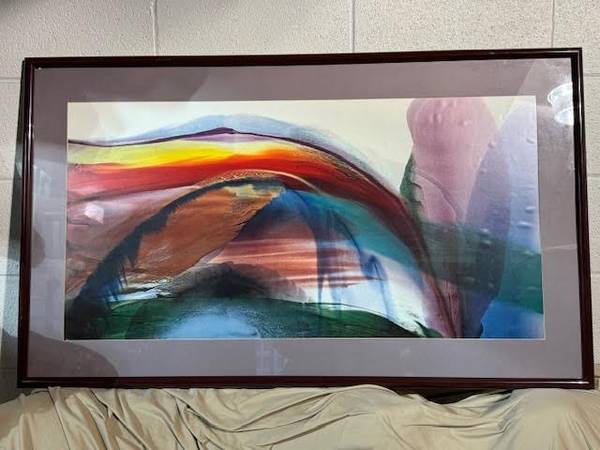 Framed and ready to hang, this abstract, colorful watercolor print will trigger your imagination. Measures 44"L X 26"H. Matching deep purple acrylic frame and mauve mat compliment the joyful color combination. Has a couple air bubbles as shown but doesn't detract from the whole picture.