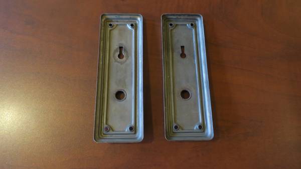 Pair of Antique door lock face plates, located in Chicago near 18th and Damen in Pilsen