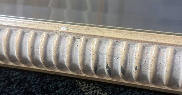 Bed, Bath and Beyond decorative wall decor / bath mirror. Very nice carved wood tan frame edge. Just a couple chips (pictured)in the frame edge gilding. Otherwise, Very good + pre-owned condition. Very elegant wall / bath mirror. Thanks. Original price $100.