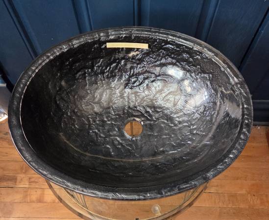 Brand new gold glass vessel style basin sink. Beautiful rich charcoal color, comes with hardware shown. Will take best offer. Approx dimensions: 19.5" x 16.5" oval shaped.