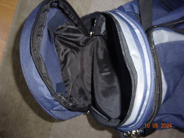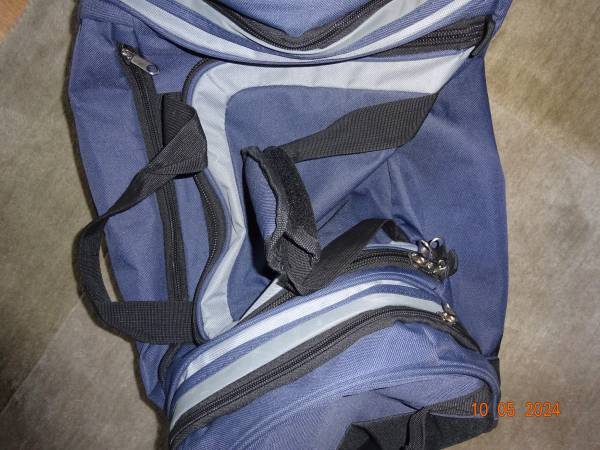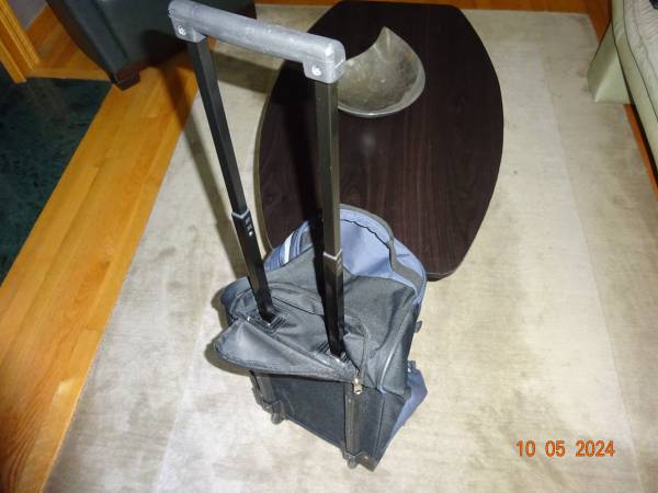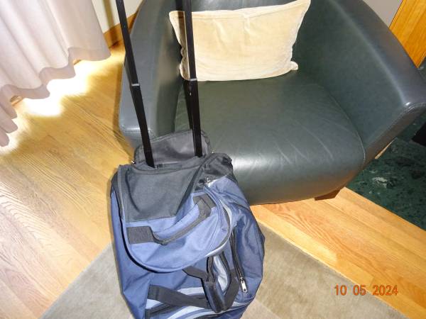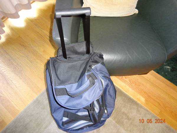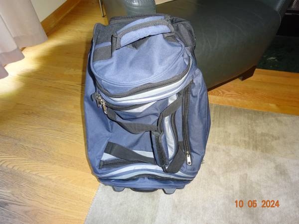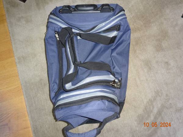 CARRY-ON IN EXCELLENT CONDITION, VERY WELL MADE AND STURDY. IT HOLDS A GREAT AMOUNT OF CLOTHING, SHOES AND OTHER ITEMS. IT HAS FOUR ZIPPERS/POCKETS FOR STORAGE. IT HAS A HARD RETRACTABLE HANDLE WHICH CAN BE HIDDEN WITH A ZIPPER. IT ALSO HAS ANOTHER TWO, ONE IN THE MIDDLE AND ONE ON THE OTHER END. IT ALSO HAS TWO ROLLING WHEELS AT THE BOTTOM, WHICH MAKES IT EASY TO CARRY/MOVE AROUND.