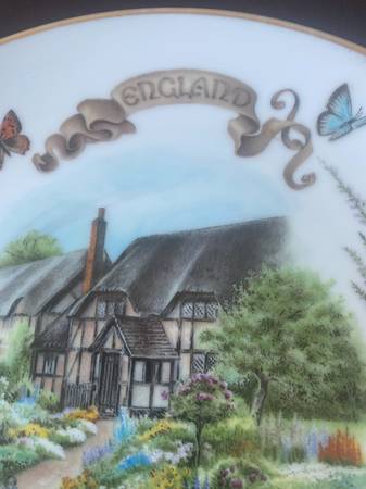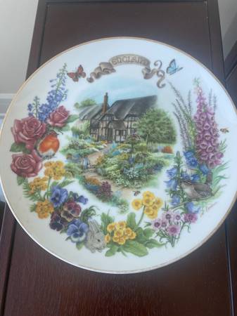 First Issue Collection Plate .Lovely variety of flowers , song bird & butterfly surround the cottage .