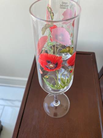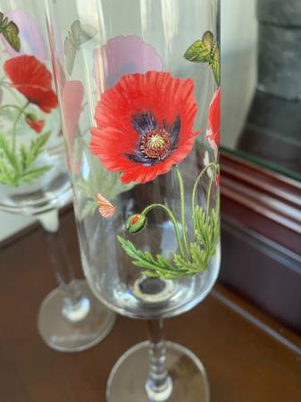 Red Poppy Flowers with butterflies beautifully hand painted, lovely gift and a great way to enjoy a sparking beverage.