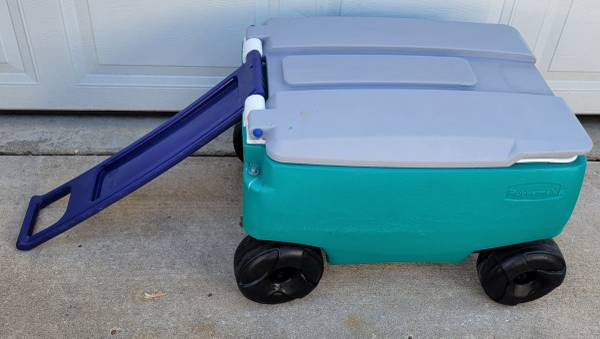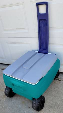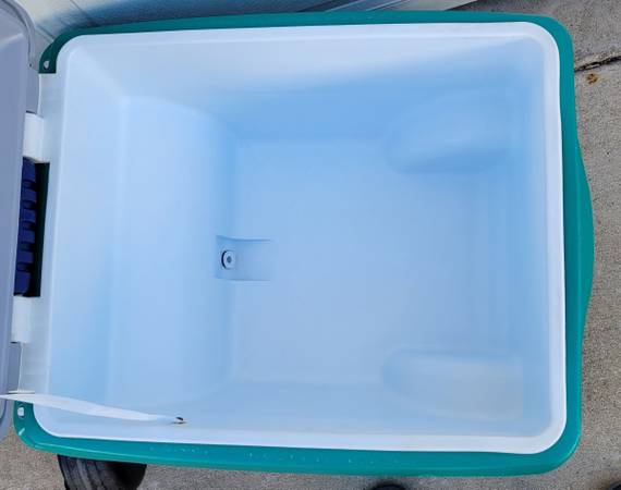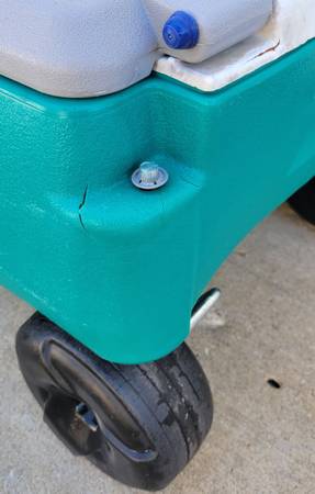 Outer shell not in perfect condition. But still in great working order. Inner tub holds water perfectly. Drain plug works perfect. All 4 wheels perfect. Lid opens/closes perfect. Handle is perfect. Outer shell has a couple small cracks. In Chicago by Belmont and Oak Park.