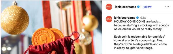 Each cone coin is redeemable at any Jeni's scoop shop for one Kid's size cup or sugar/cake cone (which is 1/2 scoop). In Chicago that is worth about $5.25 + tax depending on the shop. (So about 1/2 price if use the coin)