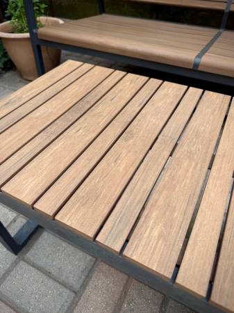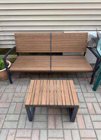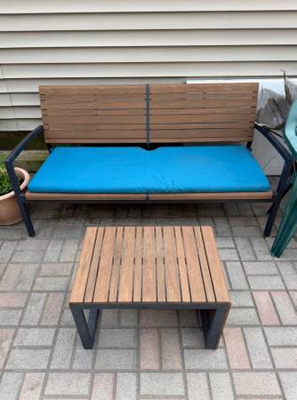 This is a 3-person outdoor bench with a matching table and comfortable soft cushion in like-new condition. It has a metal black frame and is rock solid. I originally purchased this set for $400 and I'm only asking for $100 cash.