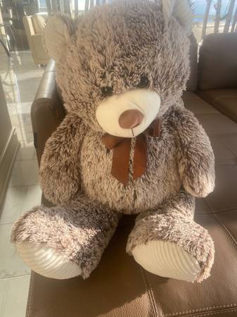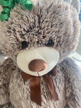 1- Large light brown teddy bear with white Paws , Ears & face , dark brown nose & black eyes, measures 28 Inches