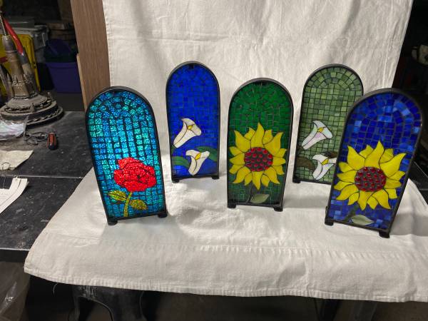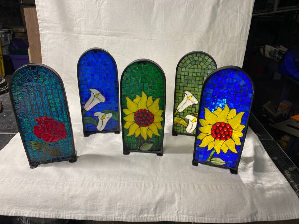 Your choice. Price is for 1. New never used well made stained glass mosaic candle holders. heavy duty solid iron frame. Holders measure 12" tall x 5 1/2" wide.