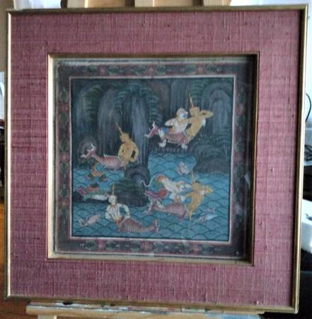 Two vintage silk style prints, East Asian characters in gilded gold frames Approximate size 14-1/2" x 14-1/2" Cash and carry local purchase and pick up only.