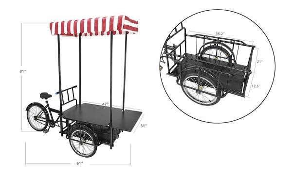 This tricycle retail kiosk is COOL! Rides reasonably well. Seat is adjustable in height. Break is on rear wheel. Comes with nice fabric canopy, large cargo space, comes with a removable MDF black melamine finished platform. Use this tricycle at farmers market, community fairs, retail shops, kiosks, flower cart, ice-cream wagon, gifts and treats vending merchine... possibilities are limitless.