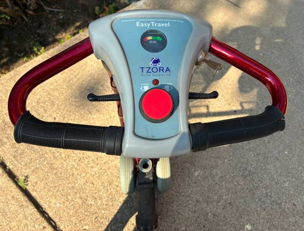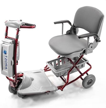 TZORA CLASSIC LEXIS LIGHT RED 4 LARGE WHEEL MOBILITY SCOOTER/2 LITHIUM BATTERIES (one for an extra) AND MANY ACCESSORIES (baskets, cover, etc.) Like new, rarely used. Original owner. Separates into 2 for easy travel. Front column (without battery) 19 lbs. Rear frame 28.5 lbs. Maximum user weight 250 lbs. Charging time 7-10 hours. Manual included. Highly rated. $1500. show contact info