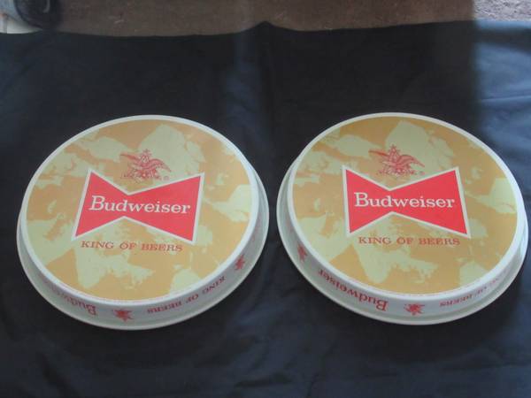2 BRAND NEW SERVING TRAYS FROM THE 1970's PHOTO SHOW BOTH SIDES NICE BAR PARTY DECORATION SERVE YOUR DRINKS IN ANTIQUE STYLE KING of BEERS DECOR