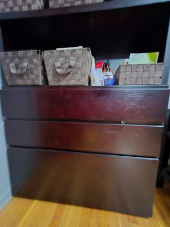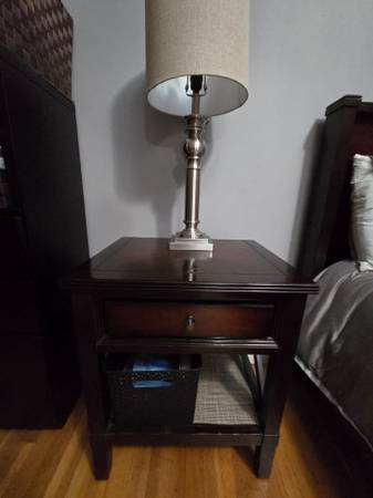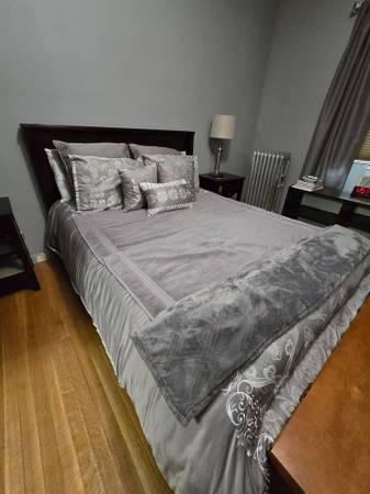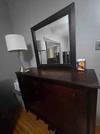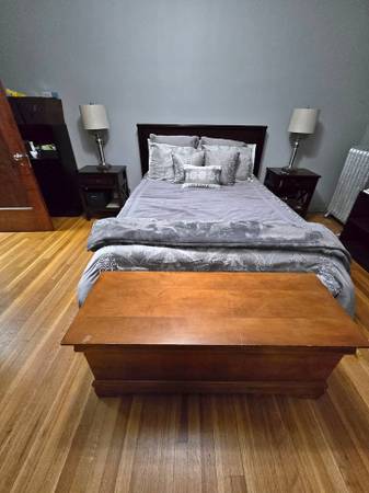 Bedroom furniture for sale. Headboard, foot board, queen size mattress and box spring in good condition for $300. The two night stands $15 each and a dresser with mirror are in fair condition $100. There is cabinet that can hold a tv on top $50 and another 3 drawer cabinet $75 where you can add baskets for extra storage. Five drawer chest for $100. All for $655.