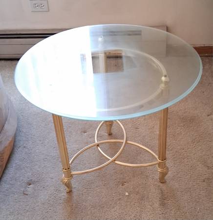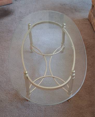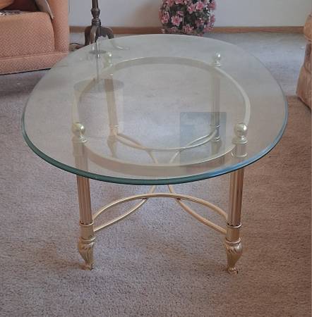 The oval coffee table is slightly over 26" high and the glass is 26"×50". The end table is 21 1/2" high and 26" in diameter.