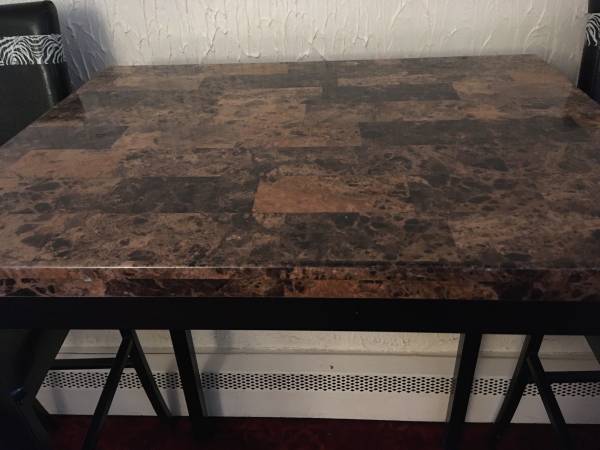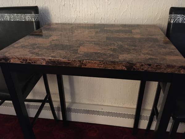 Faux marble / metal legs counter height table & 2 chairs Table measures: 30” x 24”, 41”H Chairs measure: 47”H, 23”(floor to seat) Chairs are upholstered vinyl, firm, comfortable seating Text or...
