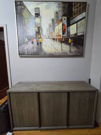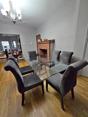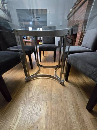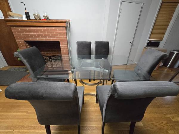 Glass top dining room table with pedestal and six chairs that have been covered since delivered. Glass table with pedestal being sold for $200. All six chairs being sold for $210. Glass This shows the actual covers of the chairs. They will be re-covered to preserve the newness. Gray wood buffet with plenty of storage inside for $250. All for $660.