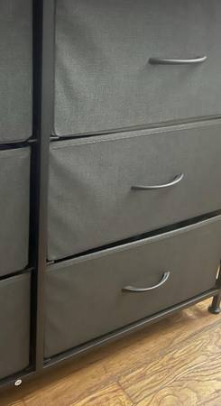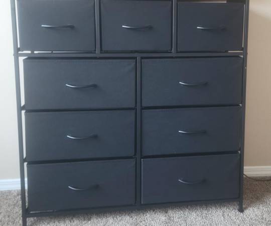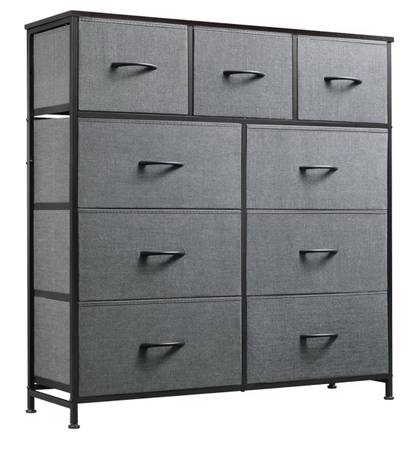 Selling a 9-drawer fabric dresser/storage tower in dark grey.