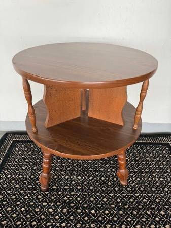 This vintage drum table is great in any room for extra space to hold books or other small items on the 2 tier open shelf. It is in excellent condition, from a smoke-free home. Measures 28"D X 29"H. This table has multiple uses, and can match most decors, light weight and easy to move. See Photos