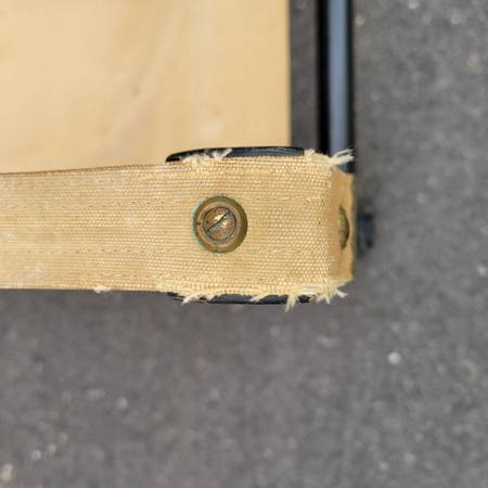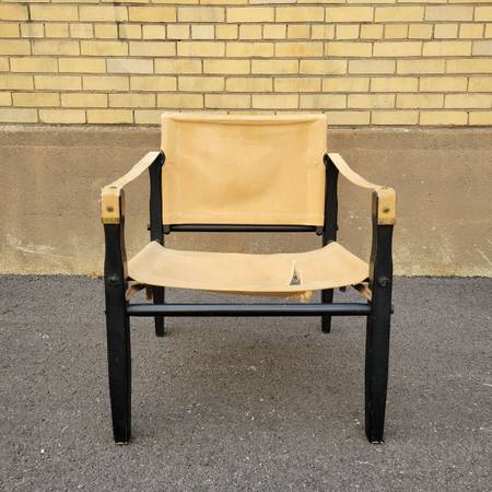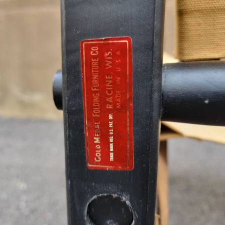 Safari Chair by Gold Metal of Racine Wisconsin. Wood frame is in great condition. Canvas-like fabric on the seat is torn and needs re-upholstered. Would look amazing in tan leather. Original brass hardware is in place and original label also.