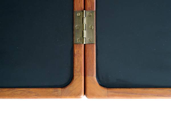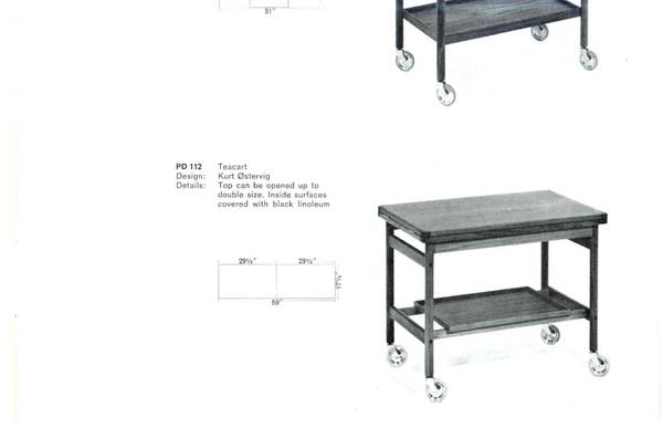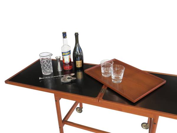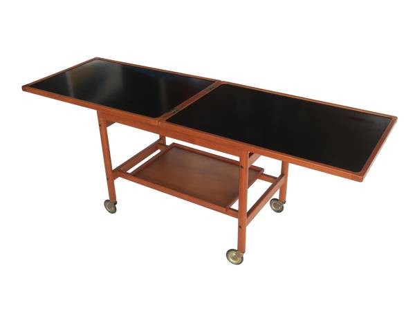 This teak fliptop serving cart, model #PD 112 in the Povl Dinesen catalog, was probably designed sometime in the 1960's and is an nice example of the flexibility of Ostervig's designs. Turned solid teak legs support a teak veneered upper tray top, with rimmed shelf below, which can be removed and used as a serving tray. For larger service, or when mixing drinks, the tray top flips open, via brass hinges, and turns into an easily-cleaned black laminate bar top.