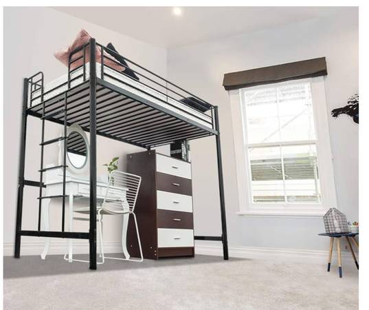 Nice twin loft bed for sale, perfect for smaller bedrooms with room for a desk, futon, etc underneath. Assembled and disassembled only once, all hardware and components are present. Safety railing is a nice feature for kids who roll around. Mattress not included, from a cat-free home. Located near Milwaukee and Lawrence, currently disassembled and ready to go.