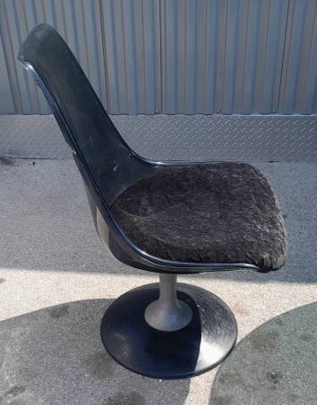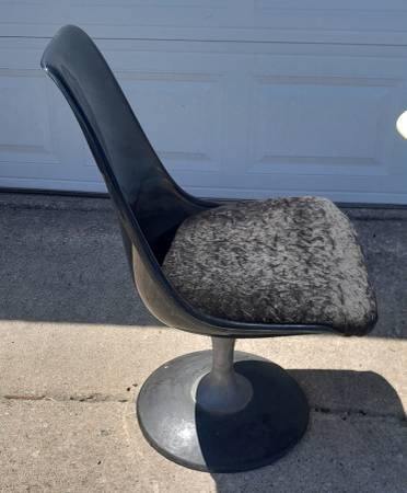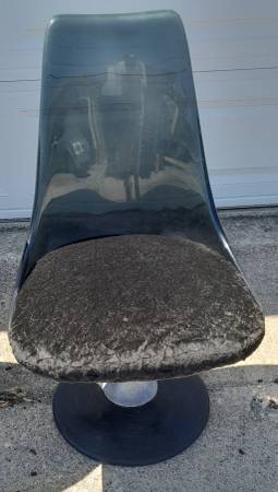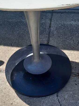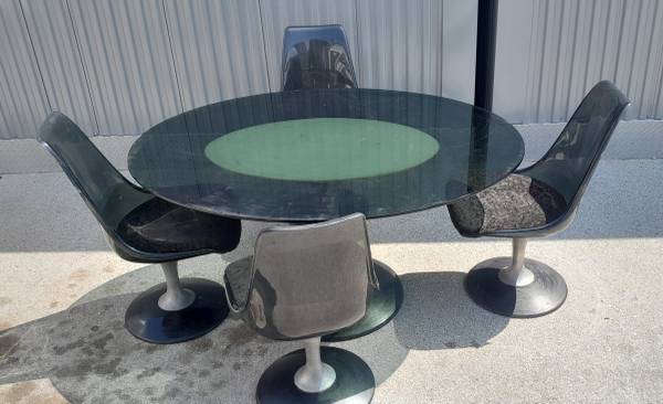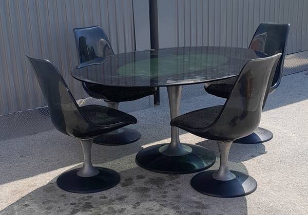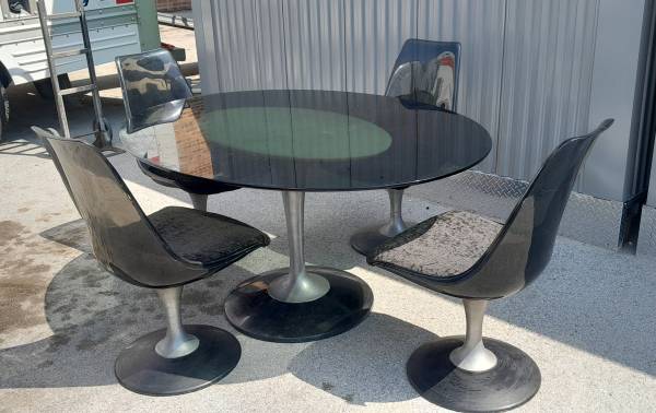 Just arrived and needs cleaning. The oval smoke glass table top is 45 3/4"×60". In good condition with a few chips to the chairs.