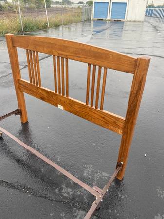Used but good condition Oak Wood mission style queen size bed frame. Well made and sturdy. Bed frame with clean box mattress if you want it. Frame measures 86" long x 60 1/2" deep. Headboard is 46 1/2" tall. Can deliver for an additional fee. Cash or Paypal only. Will accept 100 of paid in cash.