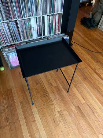 Modern metal side / coffee table, matte black finish, raised edges, in great condition.. Measures approx. 23"W x 17.75"D x 25"H