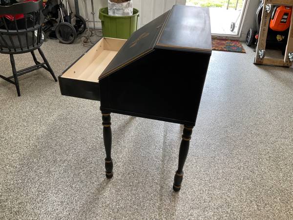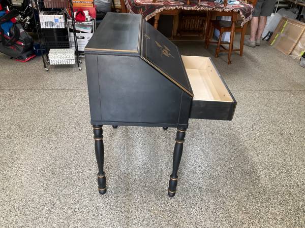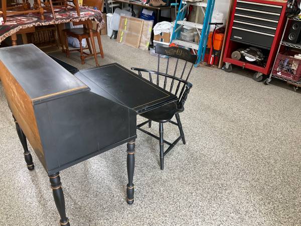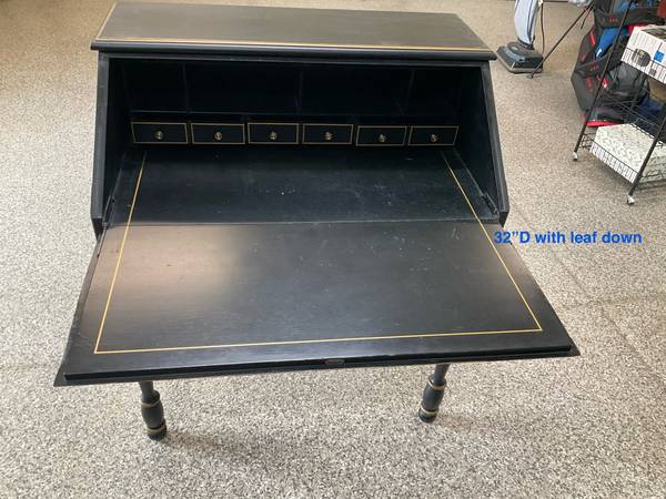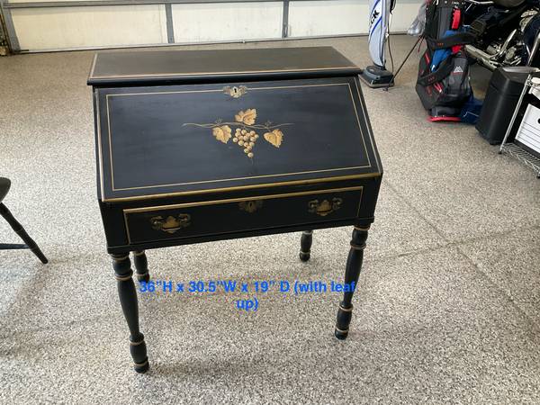 One previous owner. Originally purchased in 1960. Desk has normal wear and tear. Minor scratches on chair seat. Desk has working locks, keys included. This piece measures 35.5”H x 30”L x 19”D with top closed; depth is 31.5” with top open. Easy garage pick up. Cash only. DM if interested and make an offer. Thanks for looking.