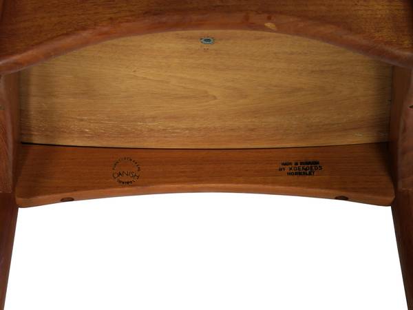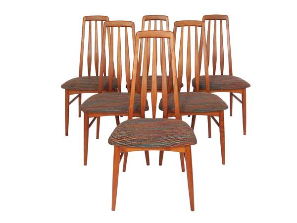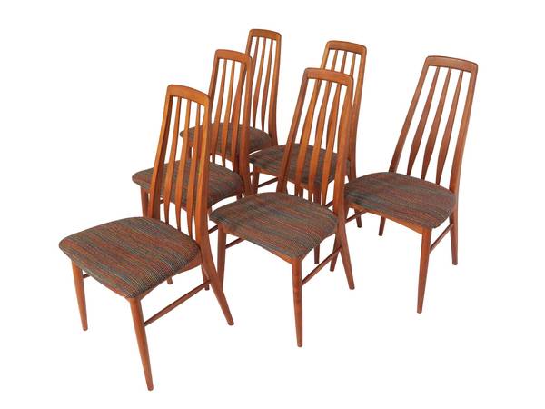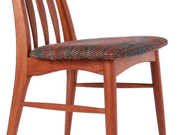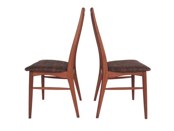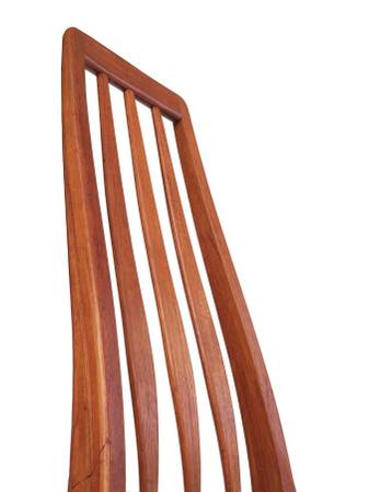 Niels Koefoed is best known for his slender-framed highback dining chair designs for his company, Koefoeds Mobelfabrik (note: Koefoeds was located in Hornslet, Denmark. Since Hornslet was included in the brand logo, the company is often incorrectly called Koefoeds Hornslet these days). The Eva chair, designed in 1964, was one of Koefoed's most iconic and successful chairs. Highlighted by an organically curved backrest with tapering slats, the Eva creates quite a presence when arranged around a dining room table.