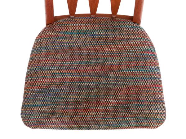 Dimensions are 19" wide by 16" deep by 38" tall, with a seat height of 17.25". These chairs would work well as a set on their own, or could be reupholstered to expand an existing set. The chairs are marked underneath with both the Koefoeds label as well as the Danish Furniture Control quality brand. The Dyrlund dining table in the last photo is not included in this listing, but is currently available in another listing.