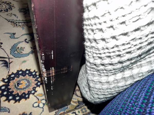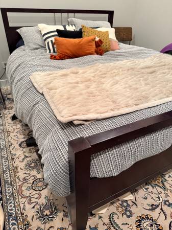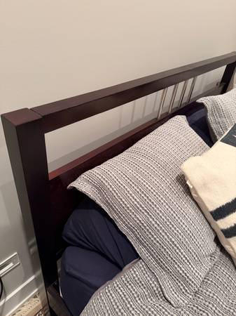 Dark wood mattress frame and queen mattress available. Attractive solid wood (not composite) shows some signs of wear as noted in photos. Must be able to pick up from Bucktown neighborhood. Pillows...
