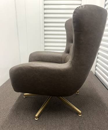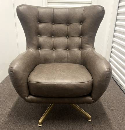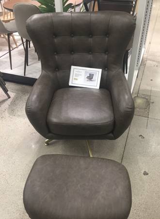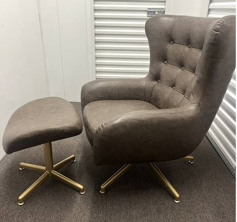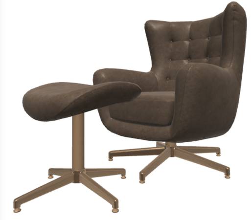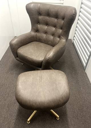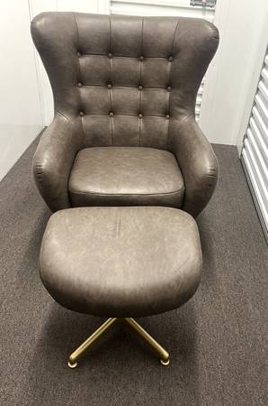 Tufted Swivel Chair and Ottoman from Project 62™ will complete the design of your living room, den or office space. The brown faux-leather swivel chair and ottoman set has a clean, modern look that will seamlessly complement most decors. The swivel chair boasts brown faux-leather upholstery for an sleek touch and outstanding comfort, while the button-tufted accents on the back give it eye-catching appeal. The matching swivel ottoman can be placed in front. Used for staging homes.