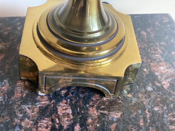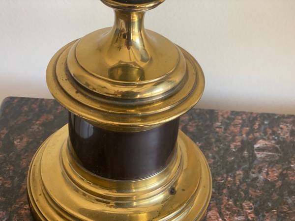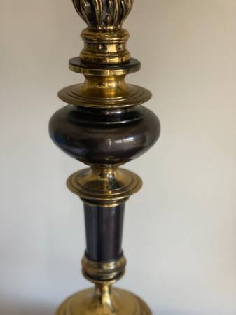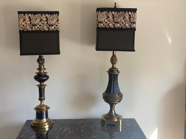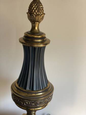 Lamp features brass toned base with fluted section and one lamp has original pineapple lamp Finial. Color of black and brass