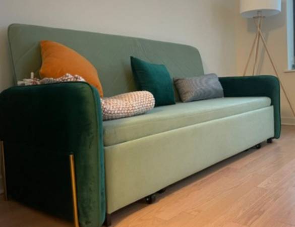 Upholstered green velvet king-size sleeper sofa bed. In a very good condition, like new.