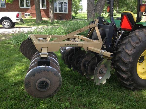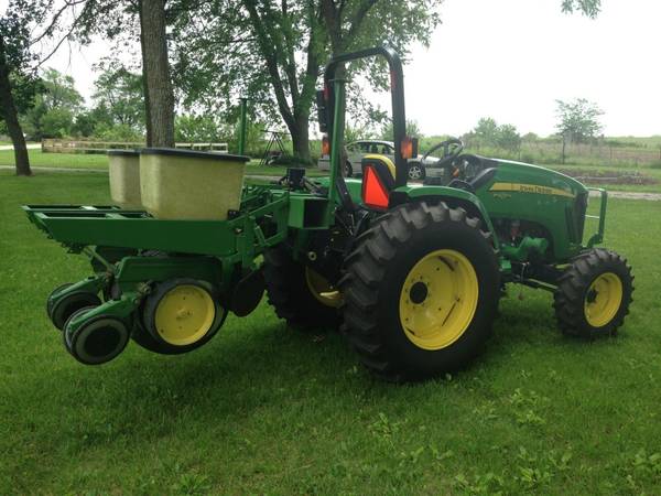 Has a 300CX loader with bucket and pallet forks. Comes with several attachments: a John Deere 7000 two-row planter (set up for corn and pumpkins), a Frontier brushhog, and a Land Pride disc.