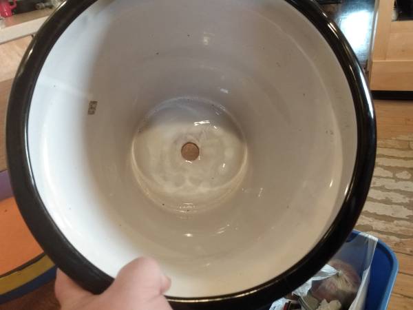 Pot has a couple of hair-line cracks at the top black rim. IF you find any leakage, you could try my recommendations. Keep soil line just under the black trim. Or, use with succulents or cactus or even use with a smaller pot placed inside Or how about just some epoxy from Dollar Tree. The asking price has been greatly reduced to reflect this flaw, which may not even pose to be a problem.