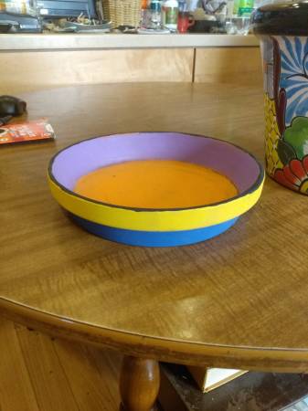 Pre-owned, never used but not flawless. This Ceramic Planter Pot has a glazed finish and drain hole. Hand-made and hand-painted by Mexican artisans in vibrate blue orange and multiple-color prints and flowers. Makers mark on bottom. Didn't come with a option of a underplate. I hope you like the one I added.