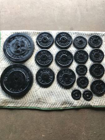 These cast iron weights are in excellent condition. They have a 1 inch hole for standard size bar, $200.00 cash must pick up, not negotiable