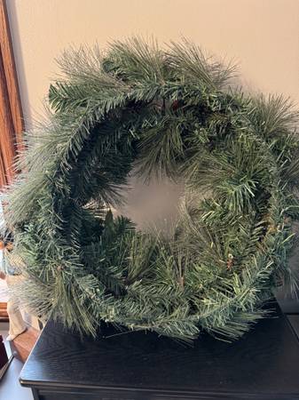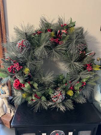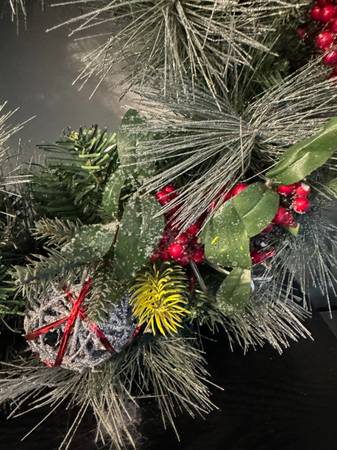 Pretty and sparkly Christmas wreath only used one season. 15.5" metal ring in the back approx. 25" diameter