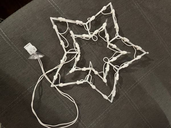15" White plastic star with white Christmas lights attached. In good working condition!