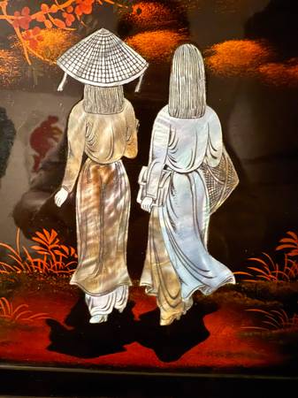 Black lacquer tray with hand-painted gold, green, and red design created by PhuongNam (Phuong Nam) lacquerware of Ho Chi Minh City, Vietnam, that displays two Vietnamese women rendered in mother of pearl inlay wearing beautiful dresses while walking along a garden pathway.