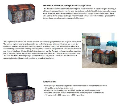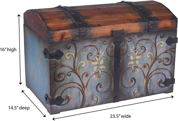 - Beautiful scrollwork painted finish with metal accent hinges on lid and corners