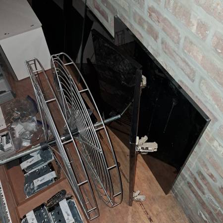 2x Drawers, various cabinet faces and trim pieces, lazy Suzan shelf, one upper cab with frosted glass front and glass shelf, hardware.